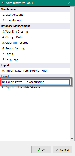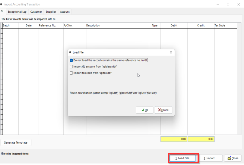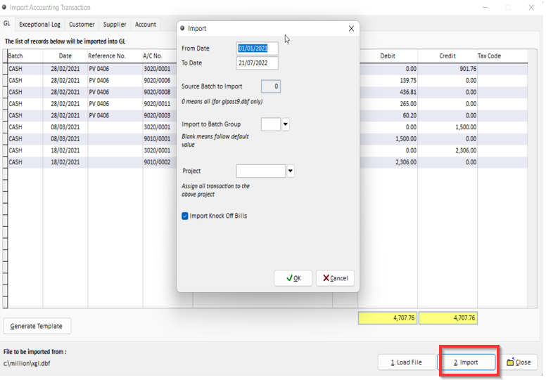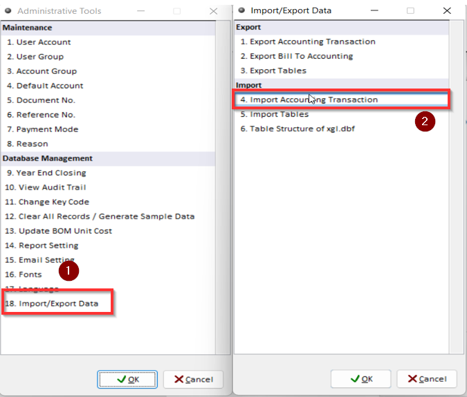 9. Login Million Account Module > System > Administrative Tools > Import/Export Data > OK > Import Transaction Accounting